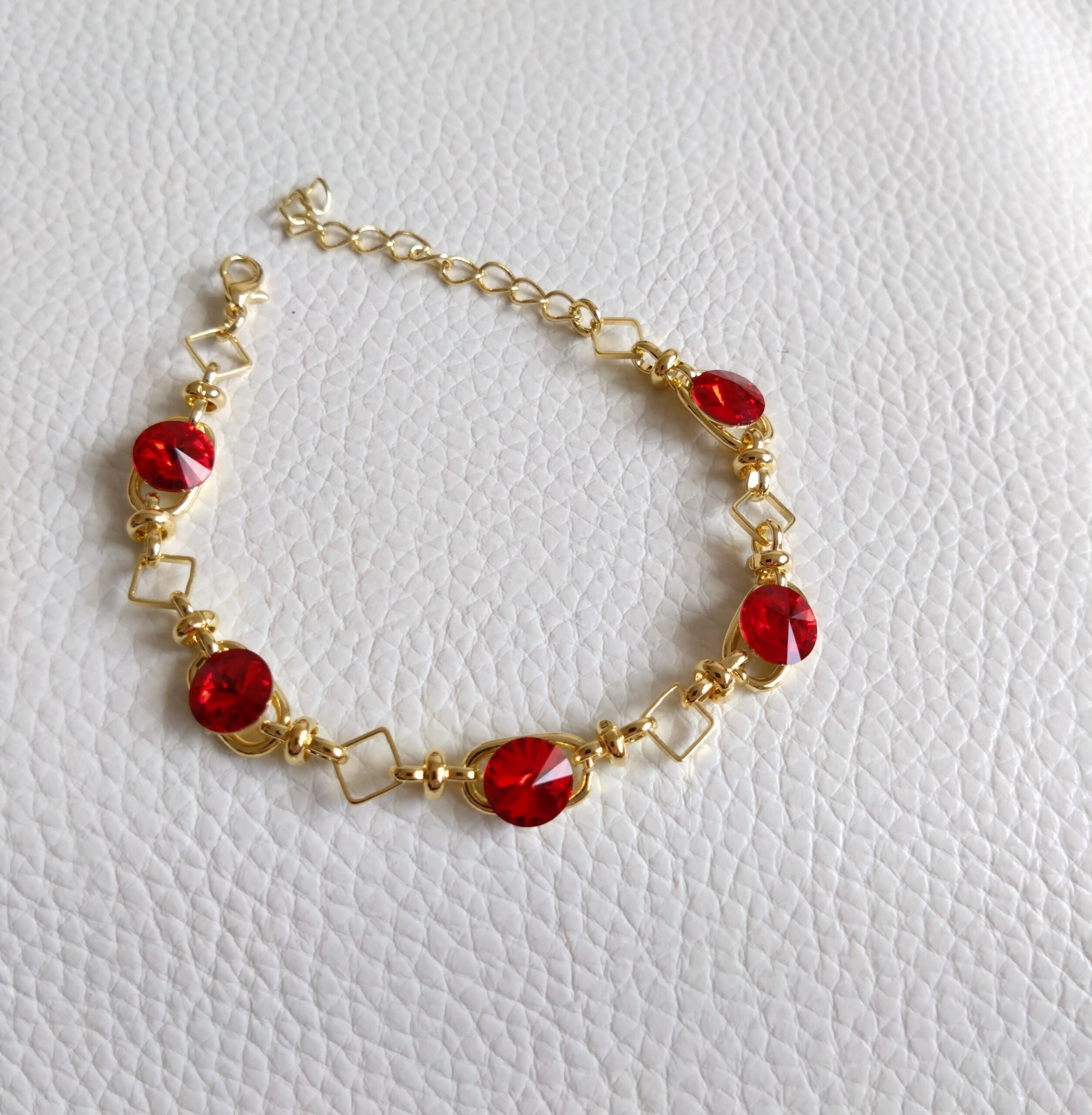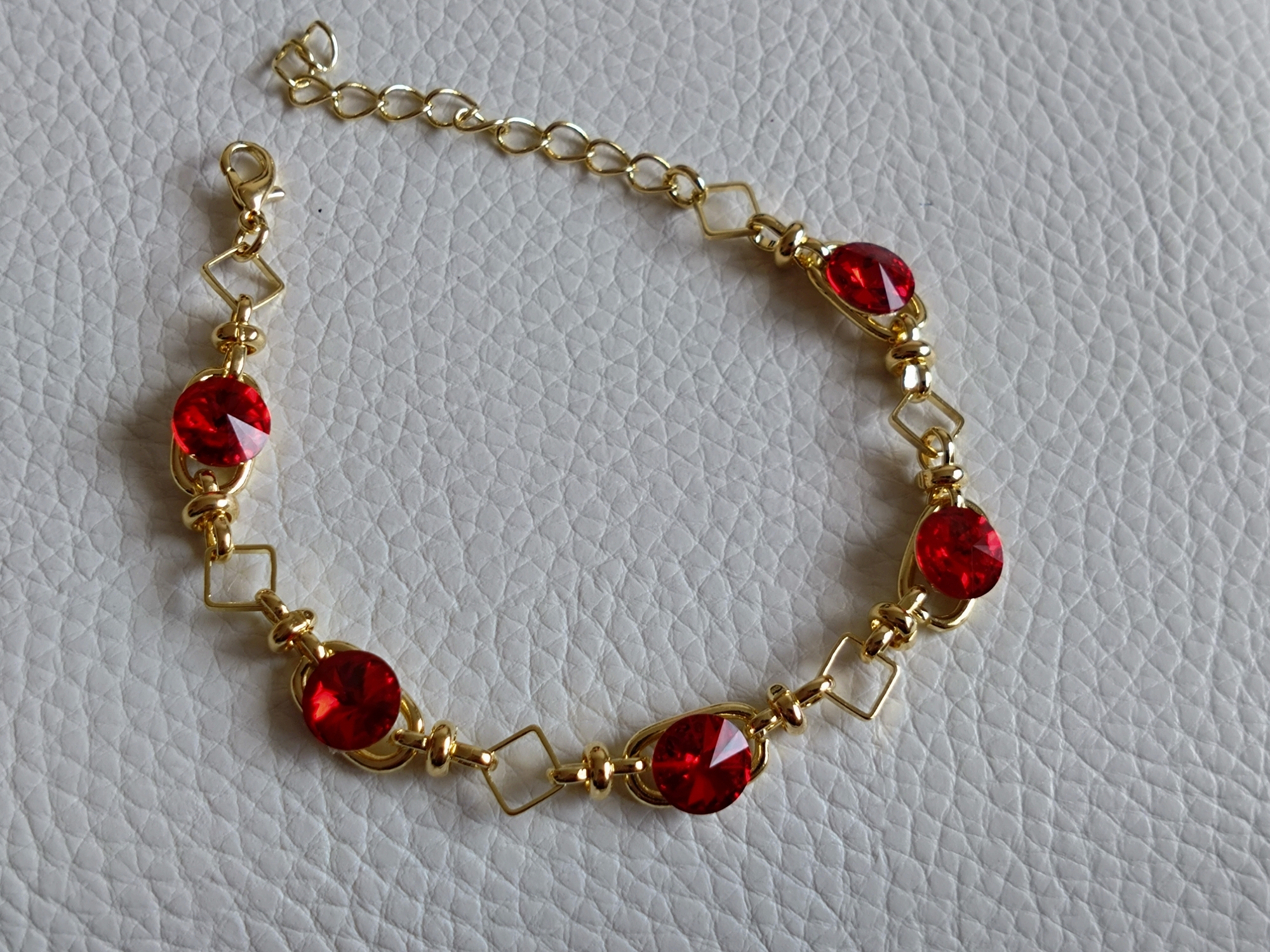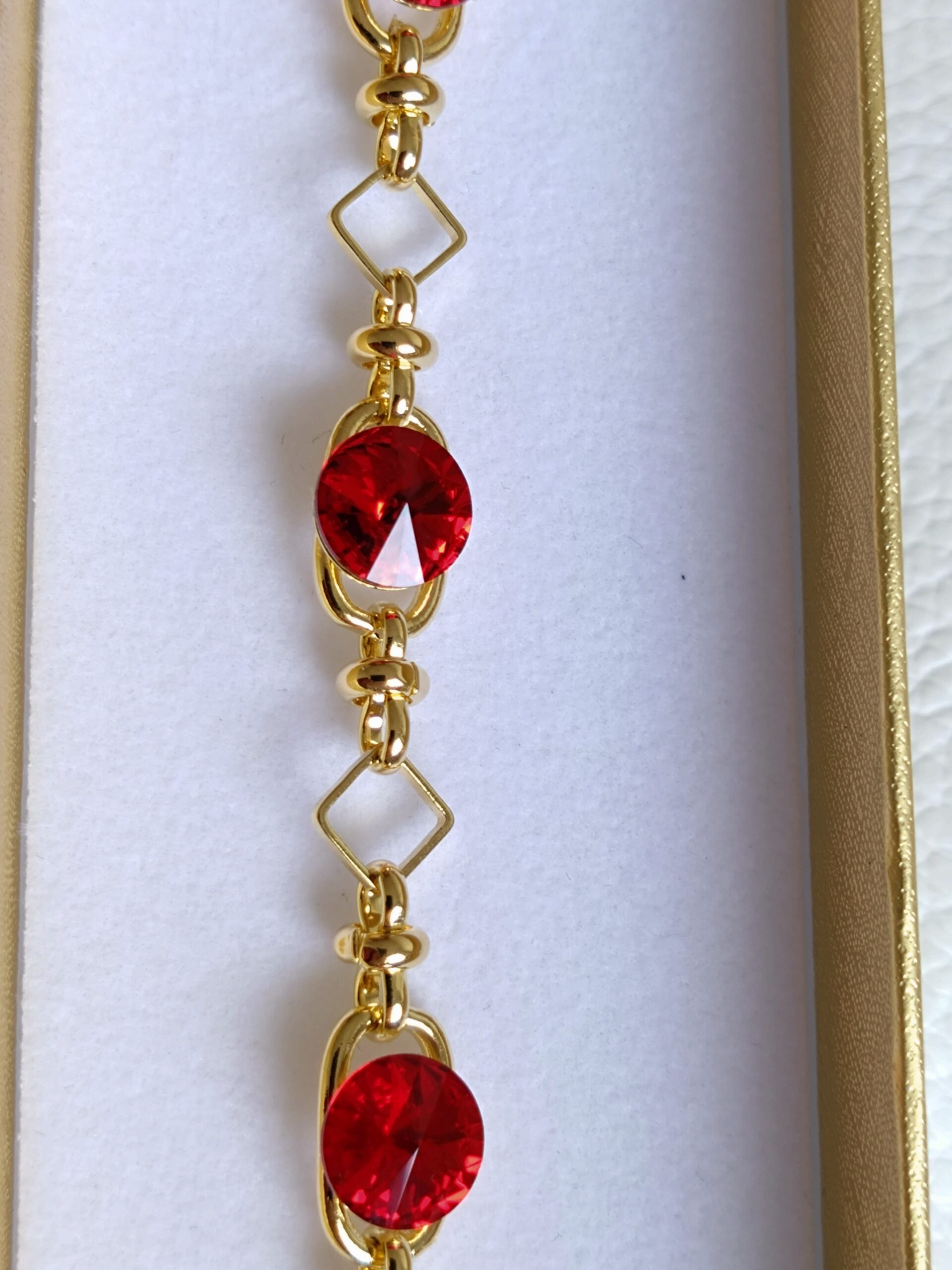 Náramok je z mosadze s povrchovou úpravou GOLD PLATING 24kt. Vsadené Swarovski® Crystal Rivoli 1122, farba Light Siam. Rozmer crystalov je 8 mm.
