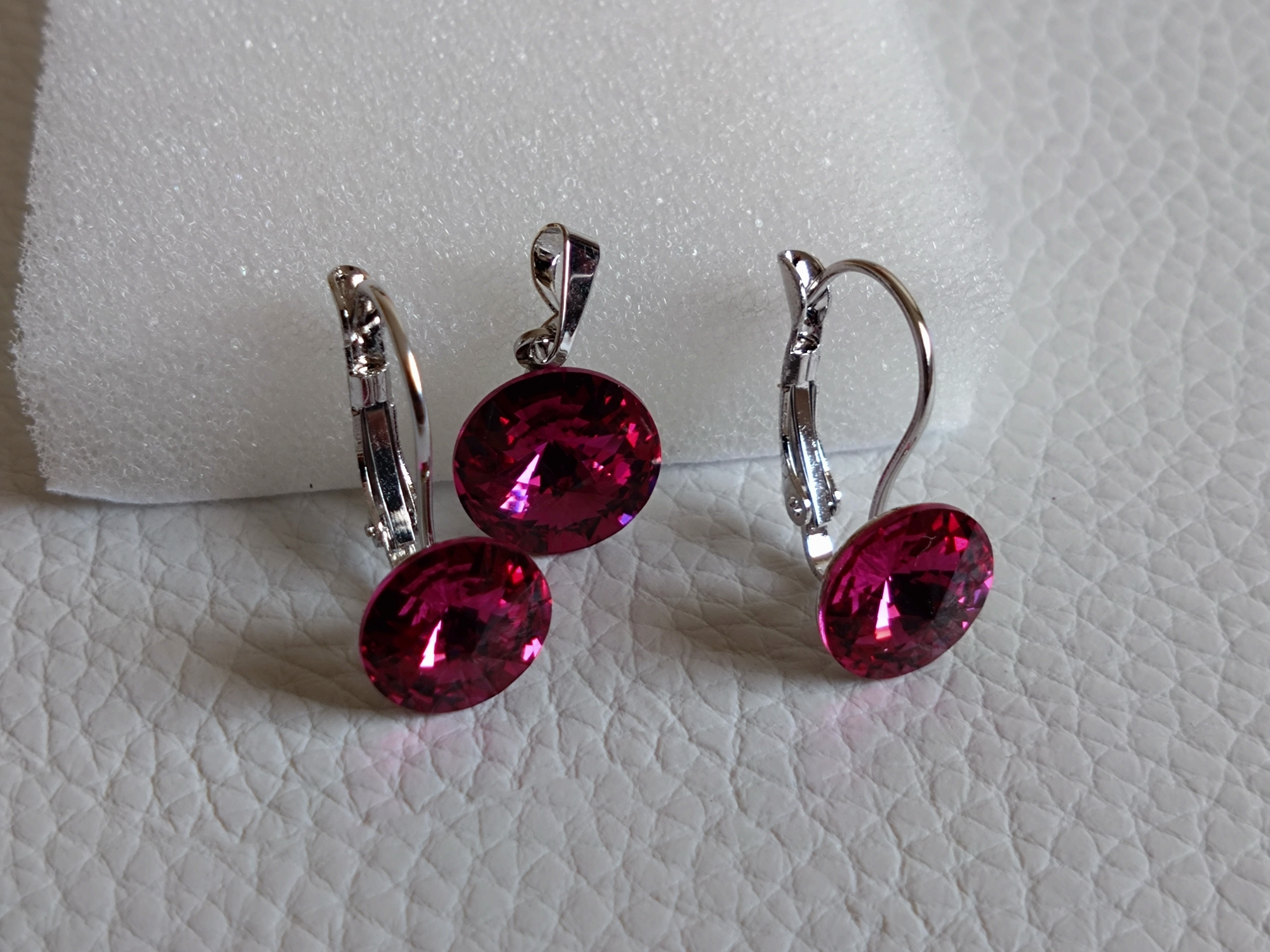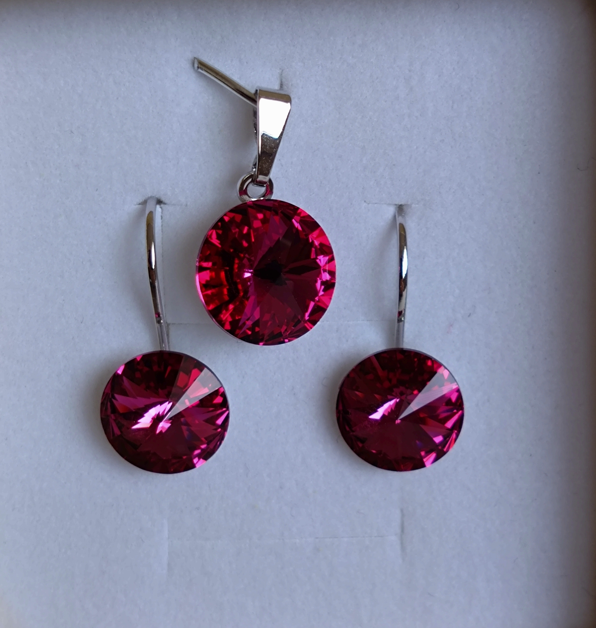 Pekná súprava naušníc s príveskom so Swarovski crystalom vo farbe Fuchsia.